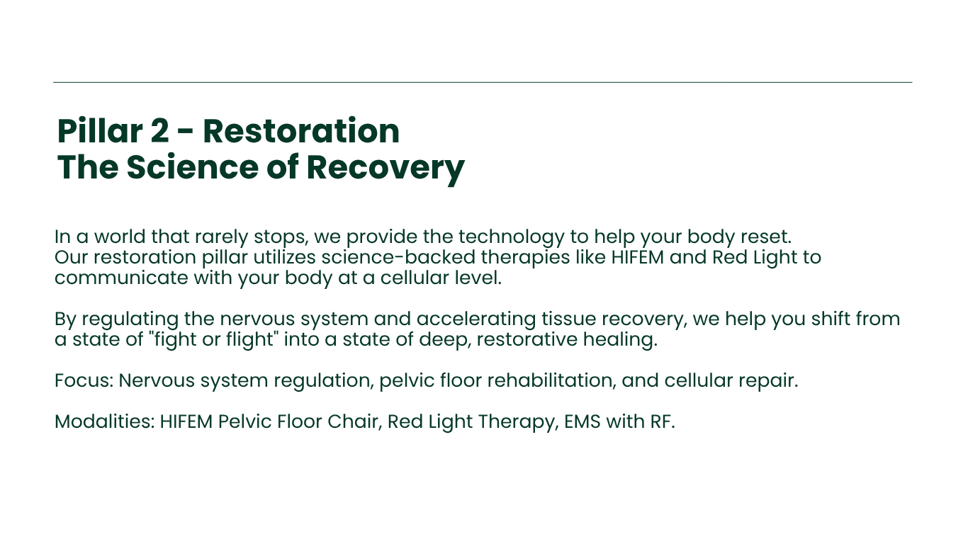 We combine science-backed technologies—like infrared light and HIFEM—with the intuitive need for rest and mindset shifts.